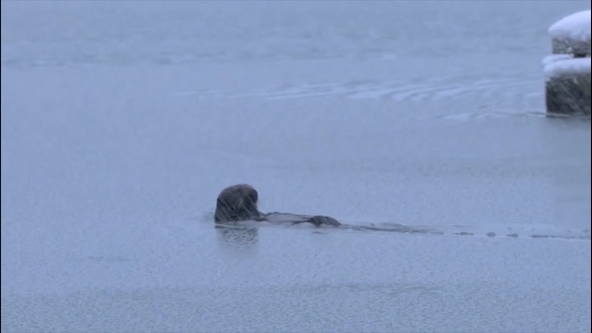 Officials with the Glacier Bay National Park and Preserve in Alaska say an otter unfazed by heavy March snowfall took its time rolling and swimming in icy waters.